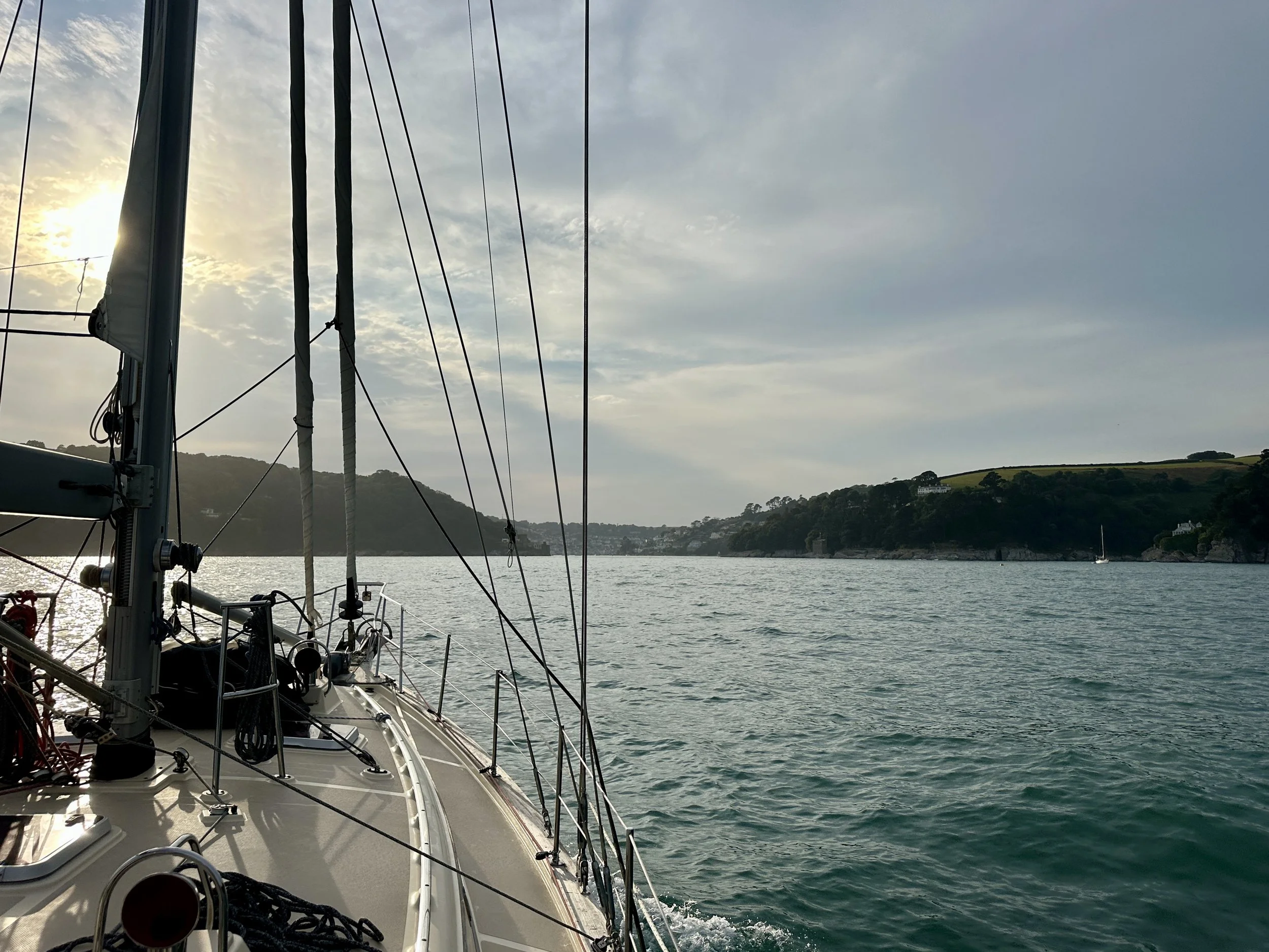 Spinnaker up again and we settled into a downwind cruise to Dartmouth. A few of the other boats that had arrived at slack water also deployed cruising chutes, but these do not work as well as EIVIVA’s Parasailer dead downwind, so we soon left everyone behind. There was a Hallberg-Rassy 36 that was only flying the foresail that kept pace all the way to Dartmouth. I think there might have been a bit of sneaky engine running. If not, very impressive.